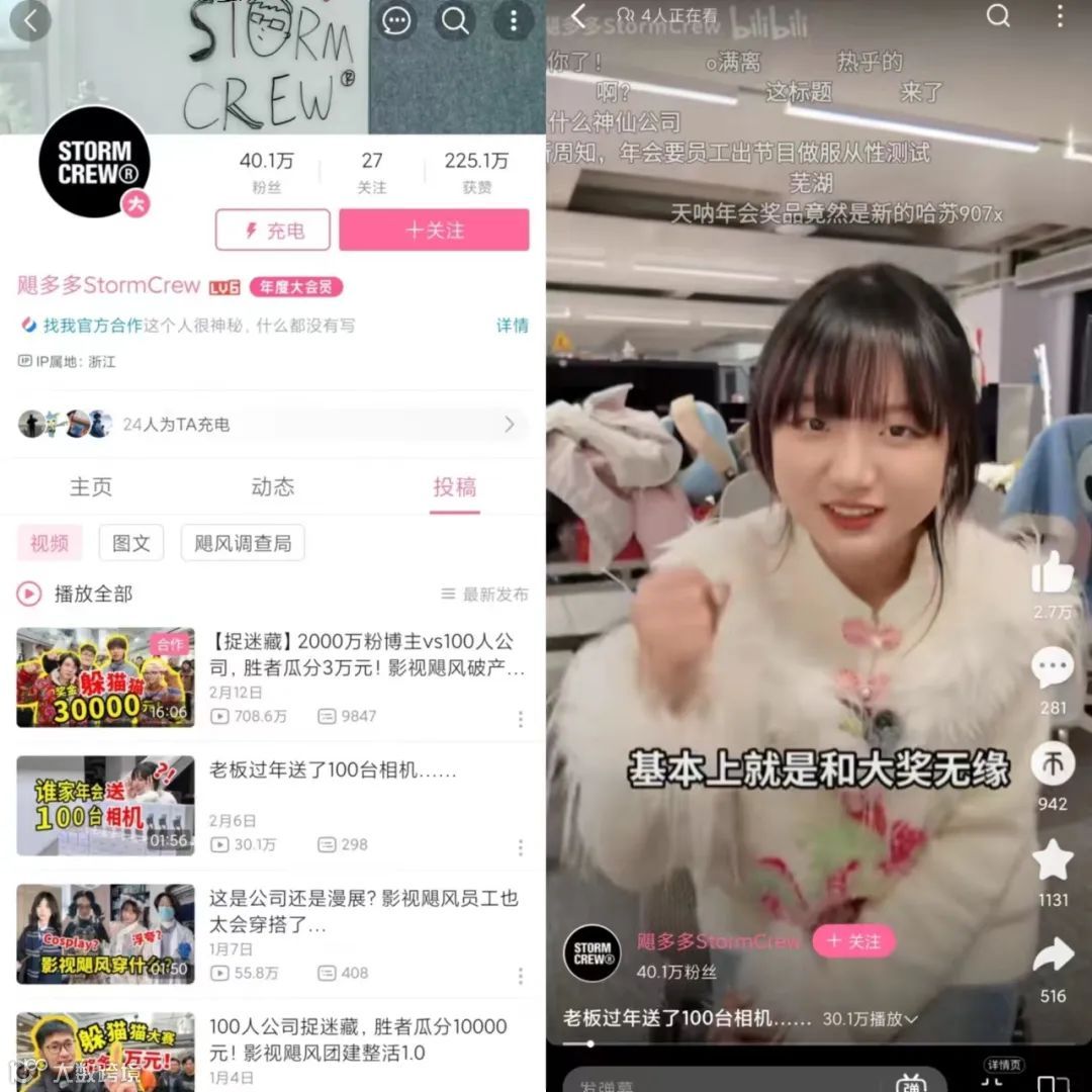 在此基础上,@影视飓风 还在2023年开启了@飓多多StormCrew 账号,生产竖屏短视频内容,内容更“轻”,最新一期的视频是综艺性质的躲猫猫游戏,联动多个B站UP主的同时,视频播放量也超过了700w。