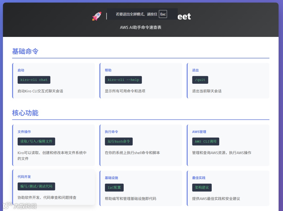 接下来就该生成应用了,在kiro-cli中输入以下自然语言就可以了,我们生成一个Kiro CLI CheatSheet,方便学习使用。