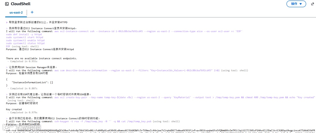 我们在AWS CloudShell中使用Kiro CLI来创建EC2实例、编写代码、直接发布运行,最后再检查代码并扫描系统环境。