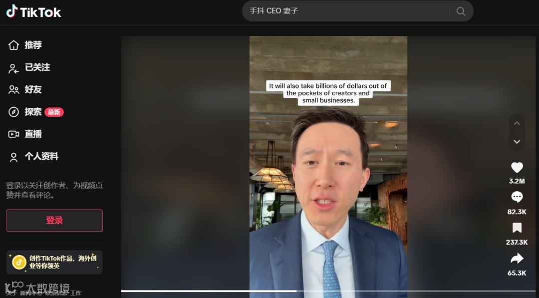 在参议院投票之后,TikTok CEO周受资也发布了回应视频。他表示这项法案“将从创作者和小企业的口袋里拿走数十亿美元,并使超30万美国人的工作面临风险。”