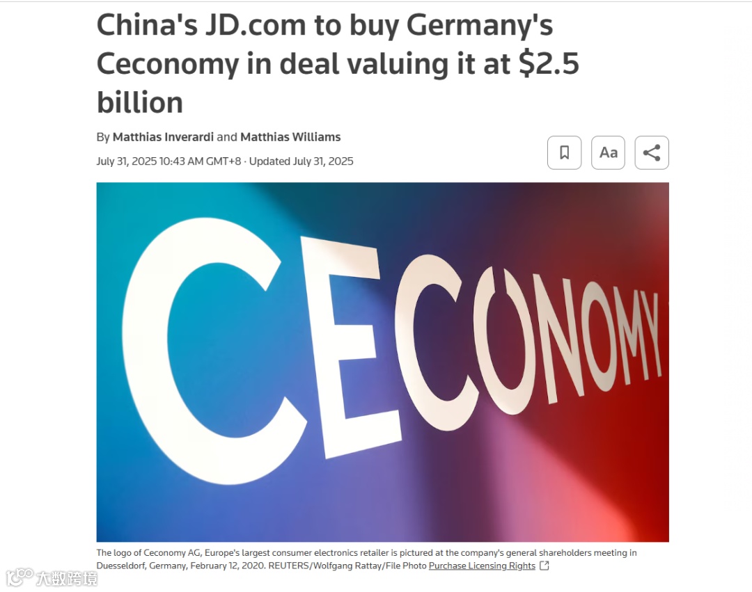 就在7月份就被爆出京东以22亿欧元收购德国消费电子零售巨头Ceconomy,目前京东通过控股Ceconomy,在里面拥有21.95%的股份,京东已成为第二大股东。