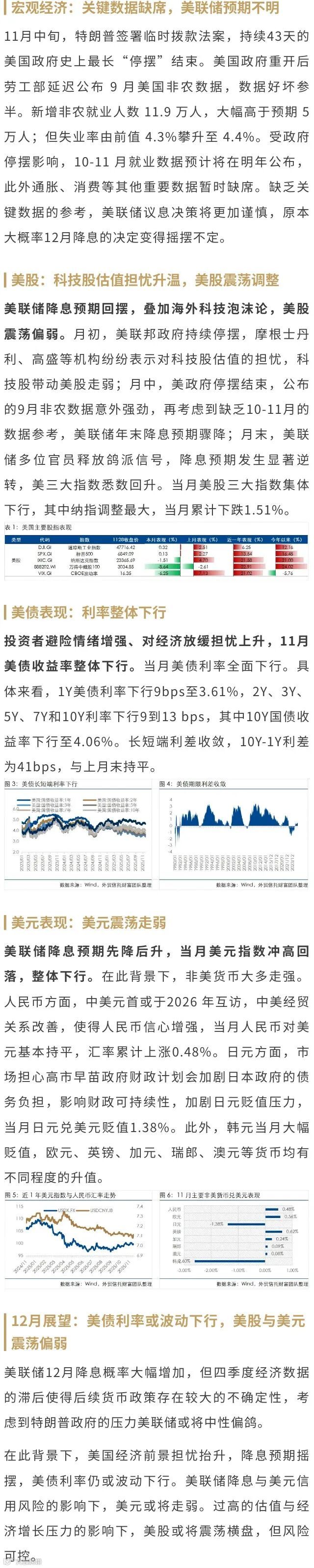 美国联邦政府停摆导致关键经济数据延迟发布,美联储年末降息预期一度回落。但月底多次释放鸽派信号,推动降息预期回升。美股等风险资产先抑后扬,整体偏弱;美元指数与美债收益率震荡下行。