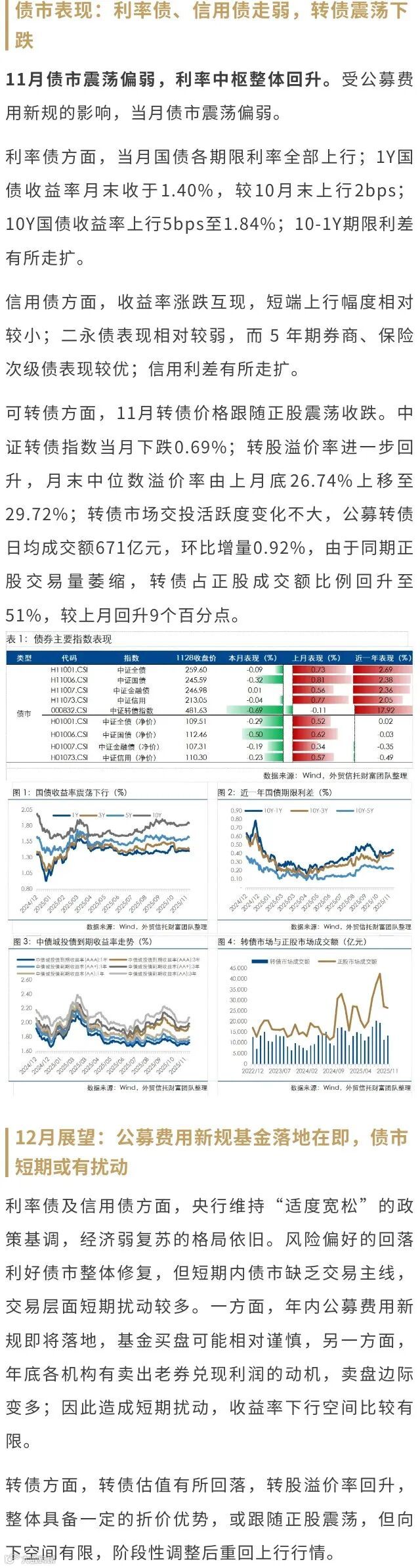 受公募基金费用新规影响,11月债市整体表现偏弱。利率债各期限收益率普遍上行;信用债收益率涨跌互现,短端上行幅度较小;可转债价格随正股震荡走低。