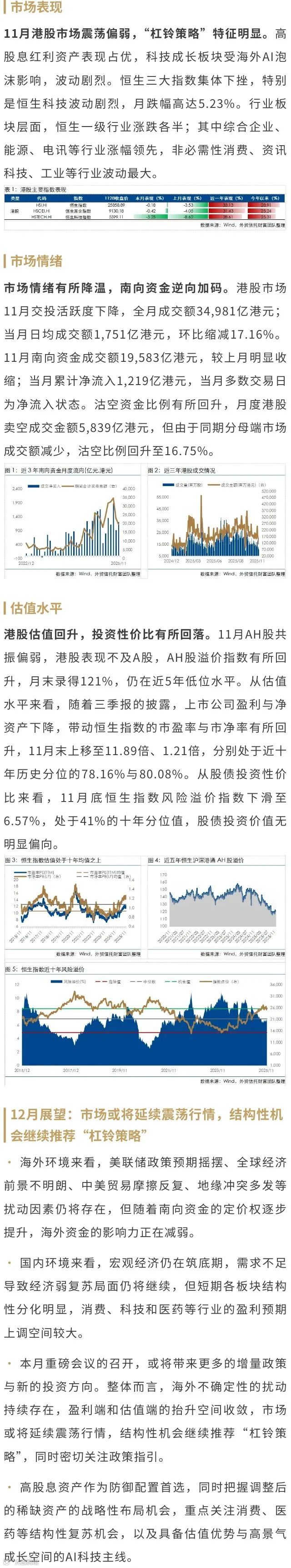 港股11月整体走弱,恒生三大指数集体下跌,其中恒生科技指数月跌幅达5.23%,波动剧烈。行业表现分化,综合企业、能源、电讯板块领涨,非必需性消费、资讯科技、工业等板块调整明显。高股息红利资产表现稳健,科技成长板块受海外AI情绪波动影响较大。