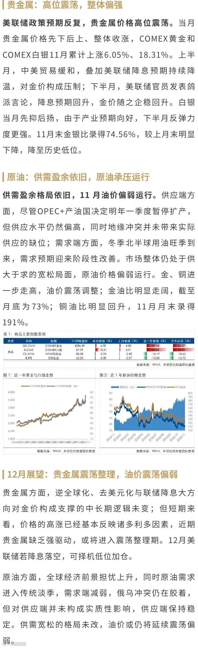 长期来看,逆全球化、去美元化及美联储降息趋势仍支撑金价,但短期利好已部分兑现,缺乏强劲驱动,贵金属或转入震荡整理阶段。若12月降息落空,可考虑逢低布局。原油供需宽松局面未改,油价预计将延续震荡偏弱走势。