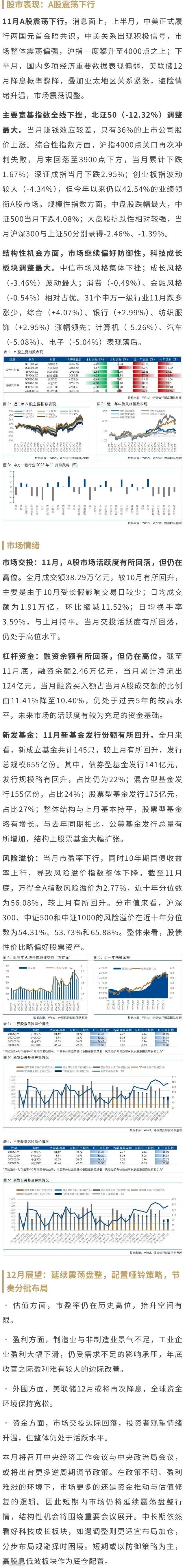 11月A股整体表现疲软,主要宽基指数全线下跌,仅36%的上市公司实现上涨,赚钱效应较弱。沪指冲击4000点未果,创业板指波动加剧。中信风格指数全面回落,成长风格调整幅度最大,消费与金融相对抗跌。申万31个一级行业中,综合、银行、纺织服饰涨幅居前;计算机、汽车、电子等行业表现靠后。市场交投活跃度及杠杆资金边际回落,新发基金略有回暖,估值水平下降但仍处于历史高位。
