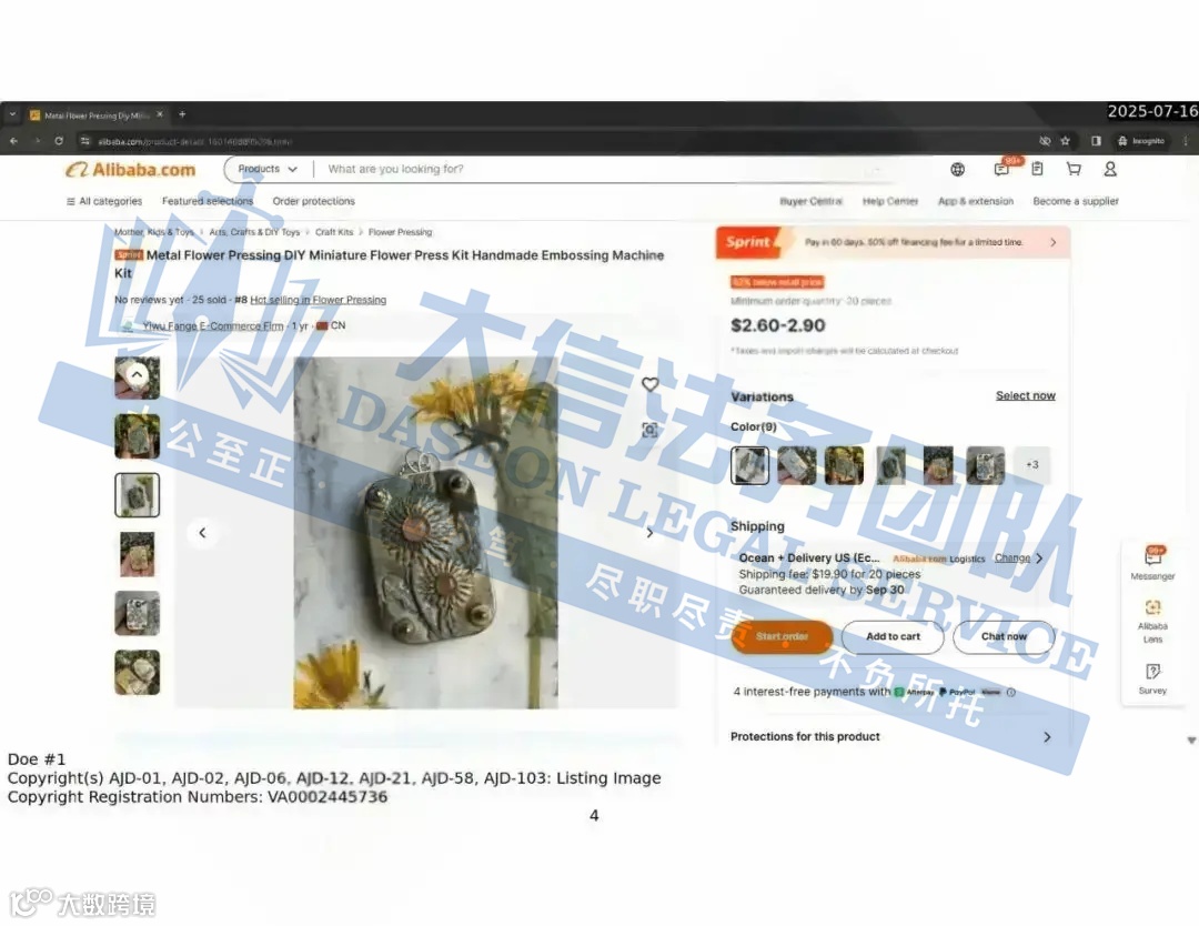 本案属版权维权,已冻结267家店铺。涉及版权号VA 2-445-736,涵盖33款植物主题压花机产品。未经授权使用存在极高侵权风险,建议跨境卖家立即排查并下架相关商品,防范TRO风险。