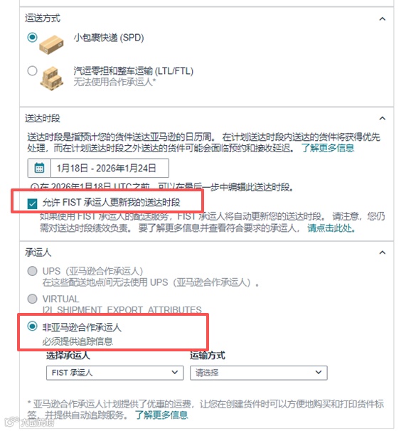 - 【承运人】保持默认选择【非亚马逊合作承运人】-【FIST承运人】,请勿更改。