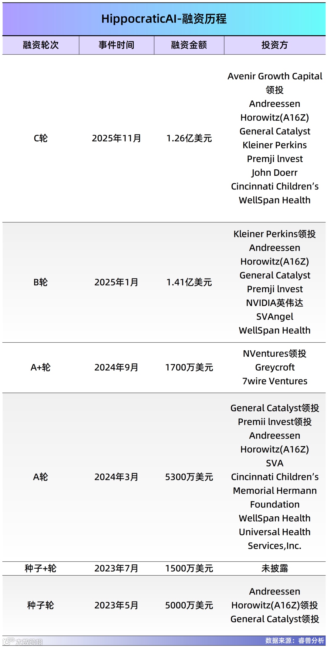 Hippocratic AI近期完成1.26亿美元融资,估值升至35亿美元(约合人民币249亿元),较2025年初B轮融资时翻倍。公司入选《财富》全球人工智能创新者50强及2025年AI医疗TOP30企业。