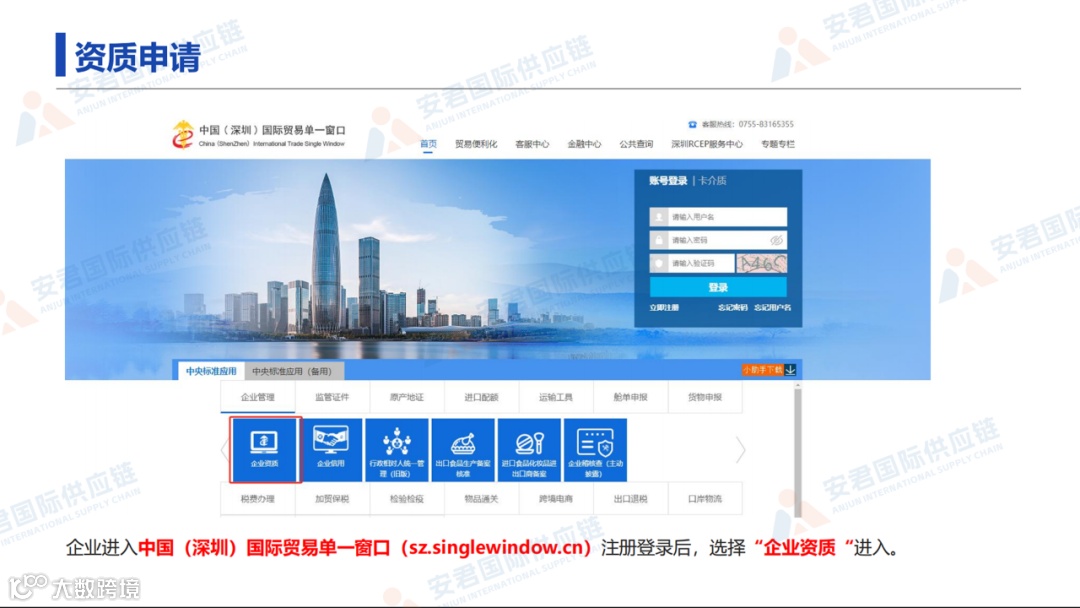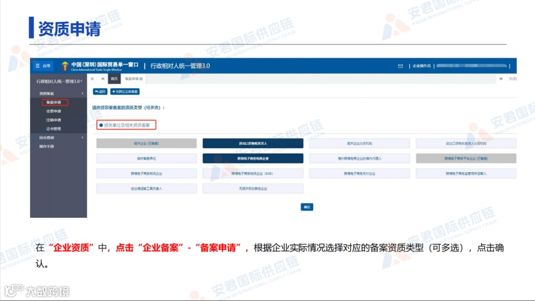 企业需进入中国(深圳)国际贸易单一窗口(sz.singlewindow.cn)注册登录。登录后选择“企业资质”进入,点击“企业备案”-“备案申请”,根据企业实际情况选择对应的备案资质类型,点击确认完成初步备案。