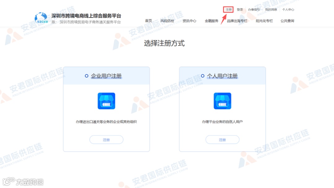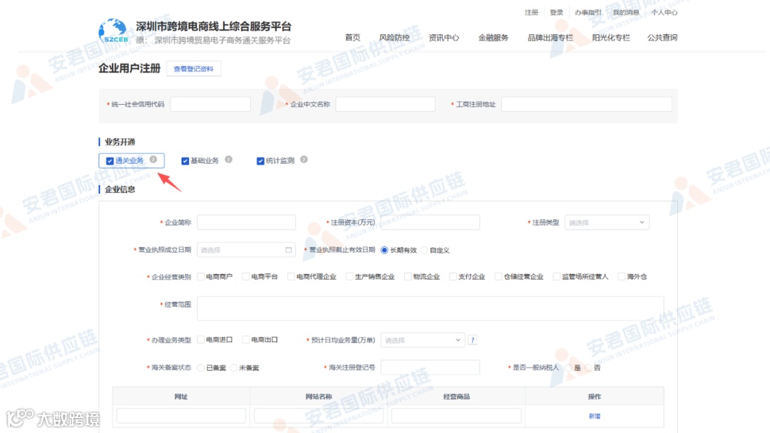 企业前置资质办理备案后,企业进入深圳跨境电子商务线上综合服务平台(www.szceb.cn)进行企业注册登记: