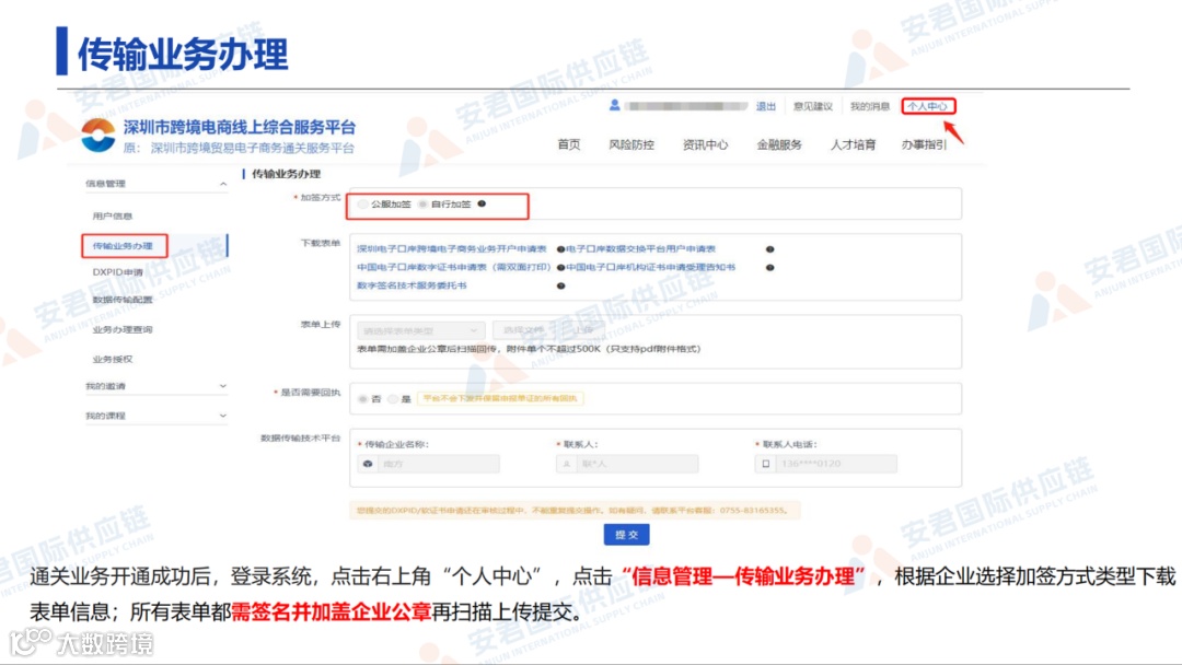 企业开户成功后,需要通过深圳跨境电子商务线上综合服务平台个人中心进行“传输业务办理”及“DXPID申请”,这两个环节是确保数据传输合规畅通的关键: