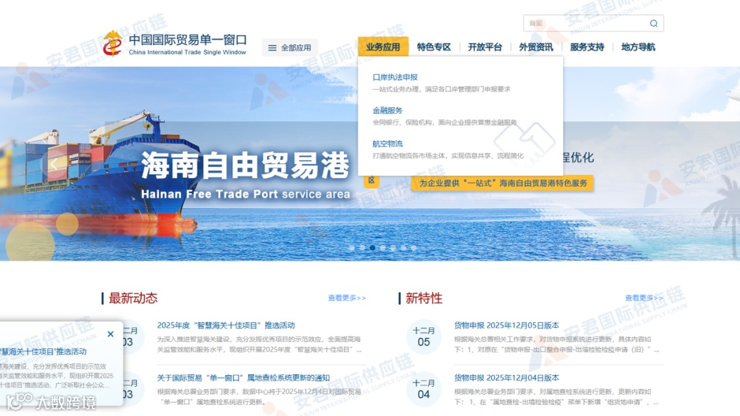 1、登录中国国际贸易单一窗口(https://www.singlewindow.cn/),点击【业务应用】页签下的【口岸执法申报】页签字样,进入“单一窗口”标准版口岸执法申报业务应用的界面。