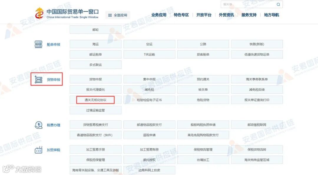 2、在口岸执法申报业务应用界面找到【货物申报】栏目里的【通关无纸化协议】,点击通关无纸化协议。
