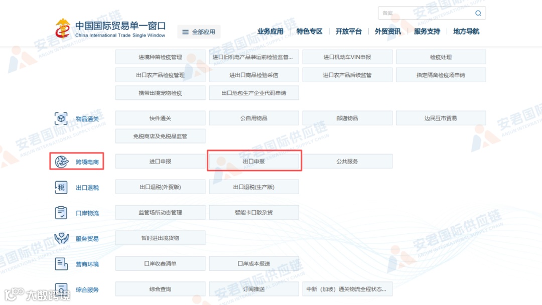4、然后在旁边的业务栏里找到【跨境电商】点击【出口申报】。