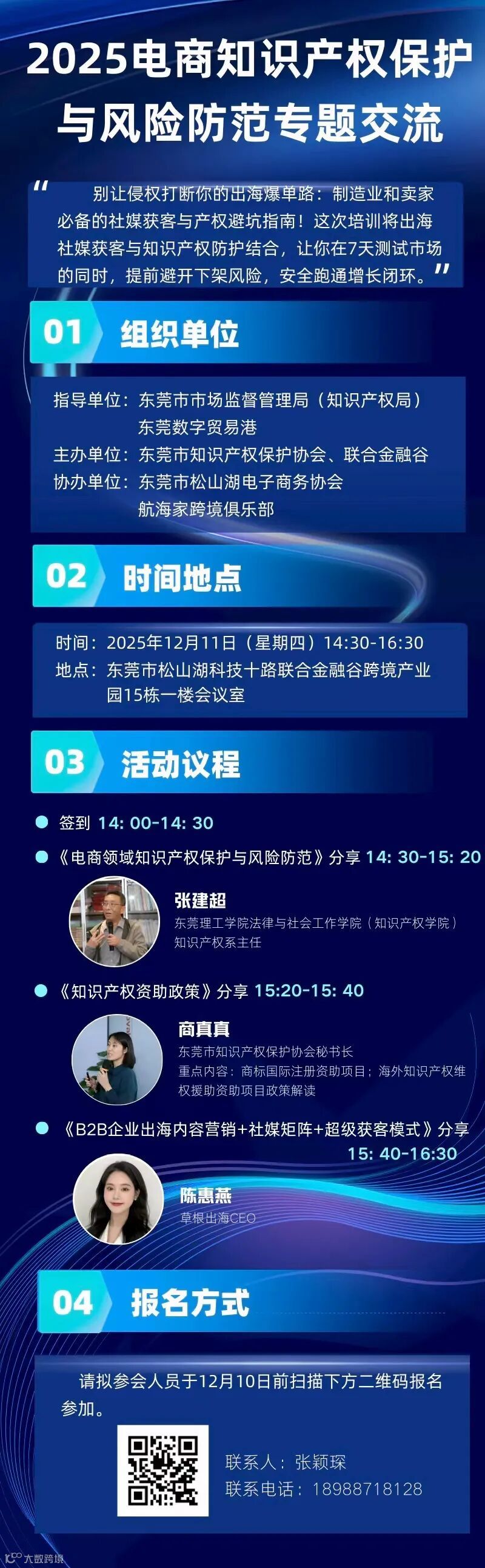 为助力企业提升合规能力、把握政策红利、拓展国际市场,2025年12月11日下午,“2025电商知识产权保护与风险防范专题交流会”将在联合金融谷跨境电商产业园举行。本次会议融合社媒获客策略与知识产权防护主题,特邀行业专家现场分享实用应对方案与前沿趋势,帮助企业规避下架风险,实现安全可持续增长。