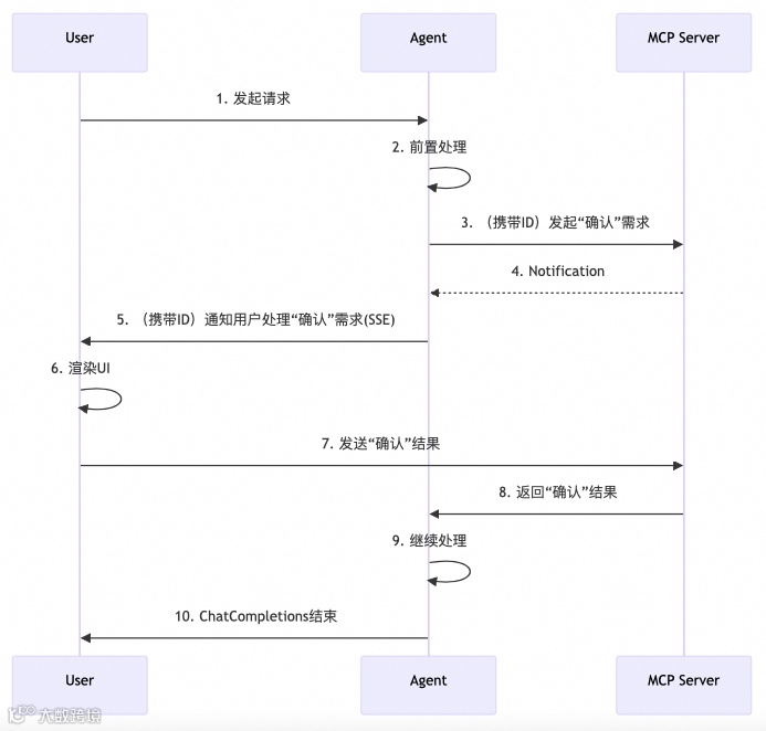 MCP协议中的Notification机制可用于解决上述问题。服务端可通过Notification帧实时推送进度与状态。在Agent调用send_inquiry后,MCP Server可通过Notification发送包含ID(凭条)的消息,通知调用方需人类确认,并触发UI渲染。