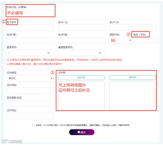 注:如不清楚银行SWIFT代码,可不填写。上传证件时,请点击“证件(正)”对应区域进行上传。