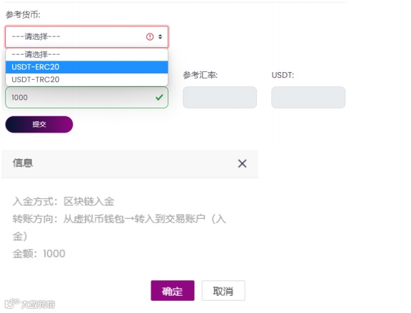 区块链入金:完成已有币种转入后,选择参考货币、输入支付金额(美元),提交申请。