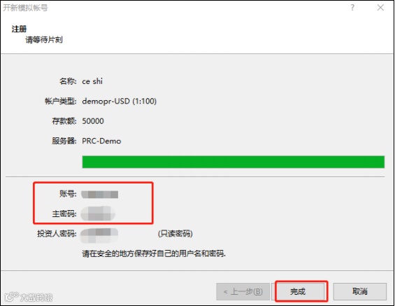 ⑥ 系统自动生成模拟账号与交易密码,请妥善记录,点击“完成”即可自动登录。