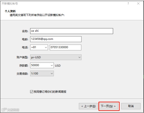 ⑤ 填写姓名、邮箱、电话(中国区号+86),设定初始资金,勾选“我同意订阅新闻简报”,点击“下一页”;
