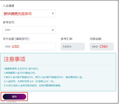 在线入金:在“基础货币”中输入美元金额,系统自动换算为人民币,确认无误后提交申请;