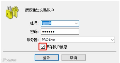 ③ 输入MT4交易账户和交易密码,选择“PRC-Live”服务器,勾选“保存账户信息”后点击登录;