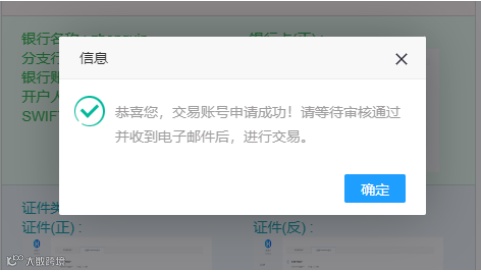 第四步:提交后出现确认页面,请核对信息无误后完成开户申请。成功后将跳转至提示页面,平台将开始审核账户,届时请关注注册邮箱是否收到审核通过邮件。
