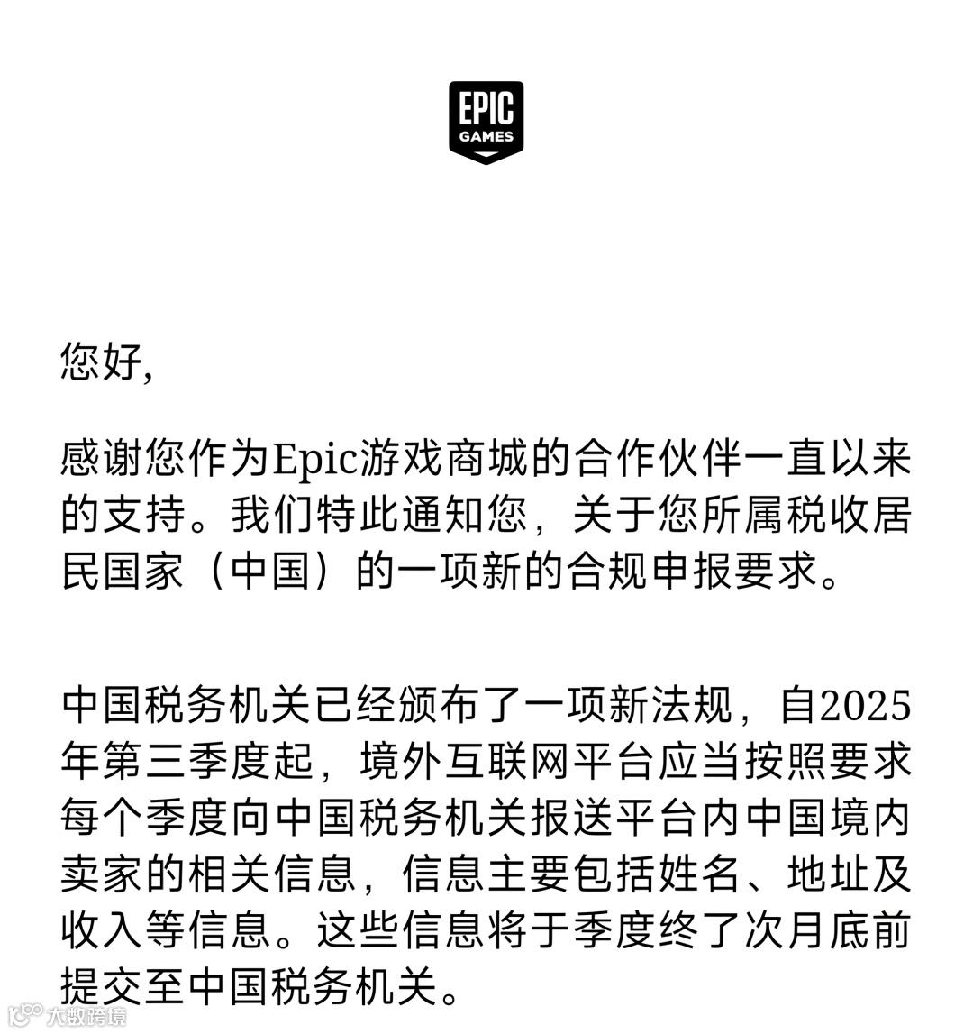 此前,亚马逊已于2025年10月启动卖家涉税信息报送工作。Epic的行动并非个例,而是中国税务监管向海外平台延伸的体现。