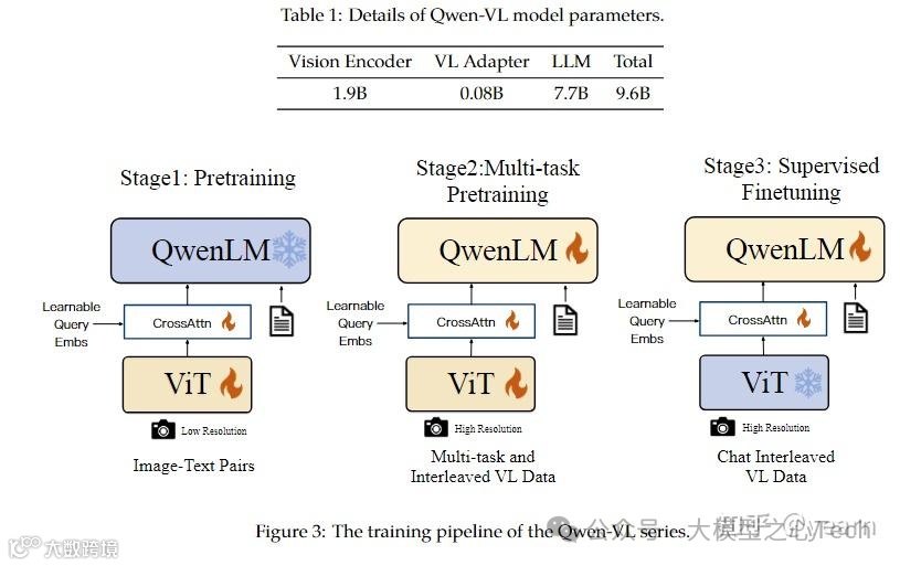 第2阶段:ViT的图像分辨率扩展到448×448,并训练ViT和投影模块的参数。它旨在进一步提升模型对复杂视觉细节的识别能力。此阶段使用的数据集包括约2500万个图像-文本对,例如LAION-400M、CLLaVA、LLaVAR、Flickr、VQAv2、RefCOCO、Visual7w等。