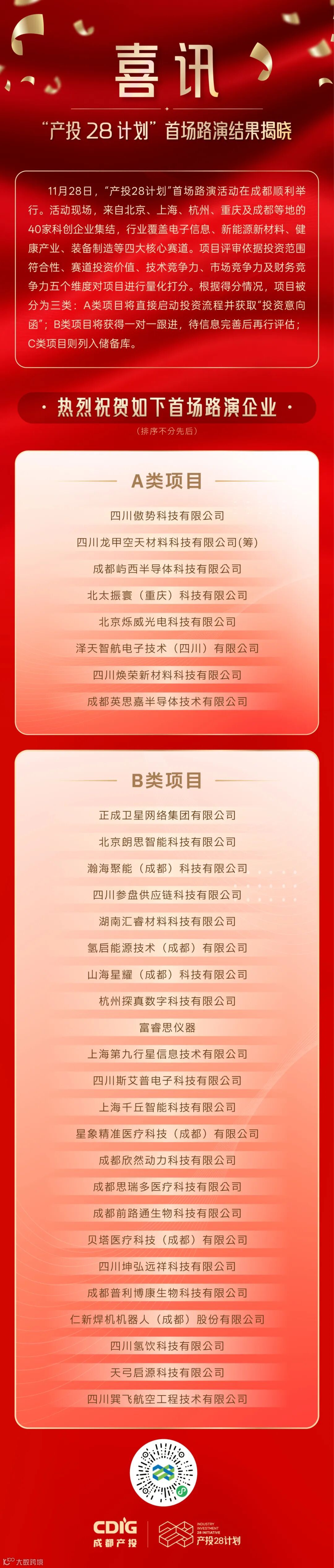 “产投28计划”是成都产投集团秉持“投早、投小、投未来”理念,所打造的首个专注于未来产业的创业生态平台。计划旨在培育具有全球竞争力的未来产业标杆,并打造全国首个未来产业垂直投资服务平台,最终形成“政策、资本、产业”协同共生的良性生态。