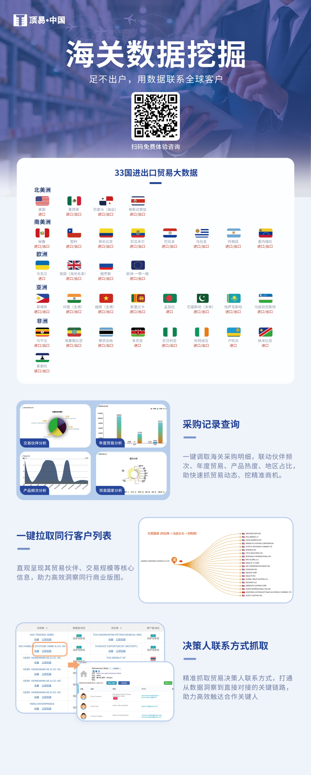 33国进口数据+27国出口数据,轻松查询目标市场进出口情况、竞争对手信息、产品趋势等,助你精准定位市场,制定营销策略!