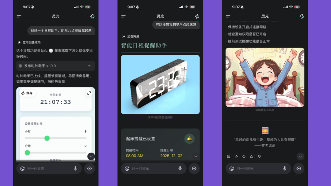 我让灵光明早八点提醒我起床。它首先给我生成了一张未来科技感的闹钟图片。然后告诉我「起床提醒已设置」,又确认了一遍提醒时间。最后还引用了一句谚语「早起的鸟儿有虫吃,早起的人儿有健康」。