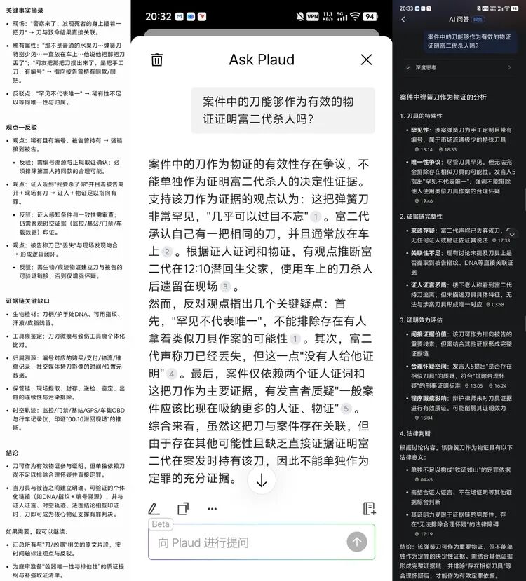 在 AI 分析方面,三款产品都能比较详细的整理出案件的核心争议点和证人、证词、物证的相关细节。