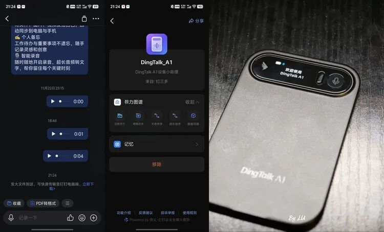 并且不要忘记, DingTalk 硬件上的麦克风按钮支持直接将对话记录并发送给钉钉上的自己,可以起到灵感记录的功能。