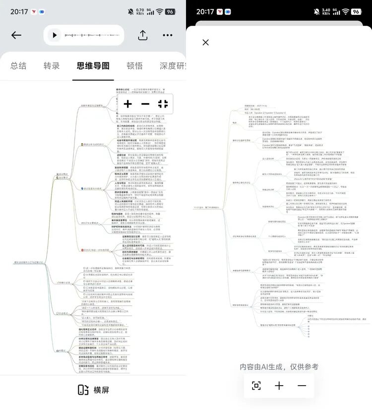 此外,TicNote 和 Plaud 在生成 AI 分析的同时,都会同步生成对应的思维导图。对比复杂枯燥的文字分析,显然这种图形的处理会显得更加直观。
