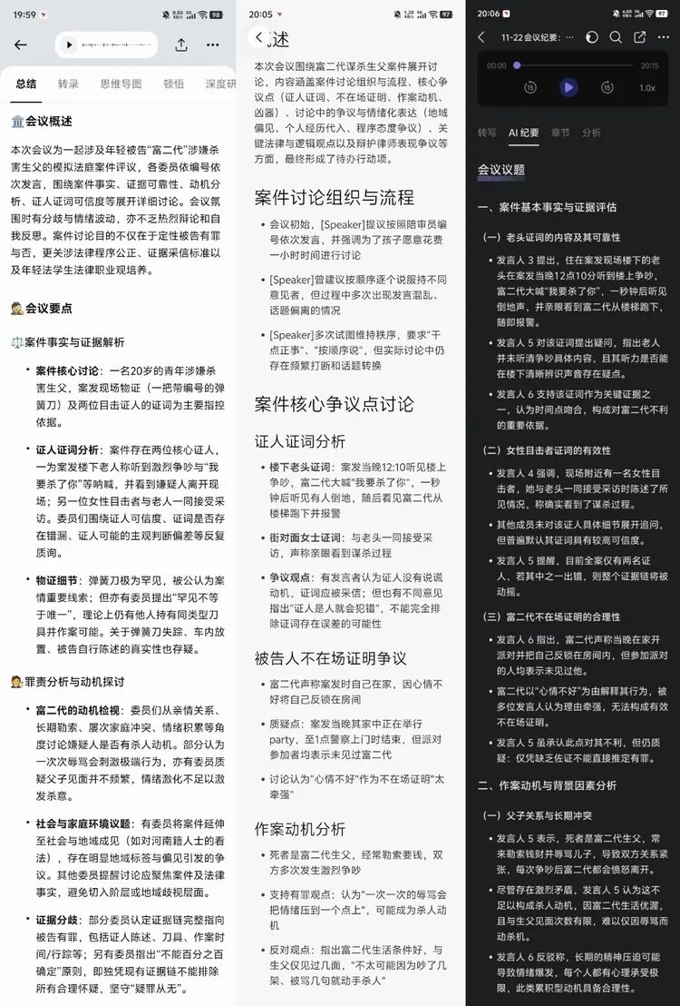 最后,TicNote 居然还可以针对素材生成一条音频播客,这条播客并不是针对整个案件的苍白复述,而是仿佛两个好朋友一起跟你去“探讨”整个案件的经过,在内容中甚至得出了“两个证人一起接受采访,证词是否会互相影响”这种结论,对于整个内容的复盘和思考都能够提出新的方向。