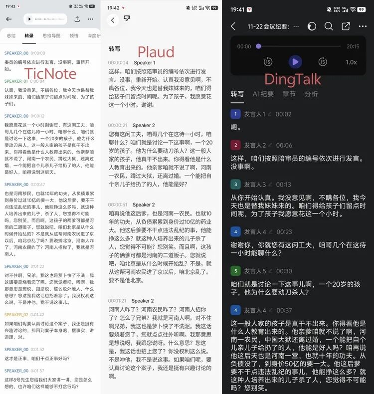 从上面这张图可以看出,TicNote 和 Plaud 都无法做到对发言者声音的“一一对应”,其中 TicNote 识别出了 3 个人,Plaud 只识别出了 2 个。