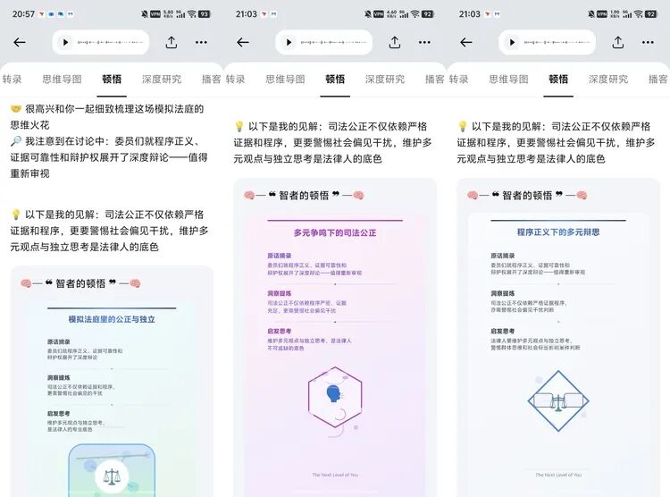 值得注意的是,在 TicNote 的软件中,除去以上基本的总结和分析之外,还有几个比较有特色的功能。「顿悟」的感觉是 AI 经过思考后给出的一些自己的“宏大见解”,但说实话我觉得噱头大于实际用途……有种没什么话说但又故意拽词儿的感觉。