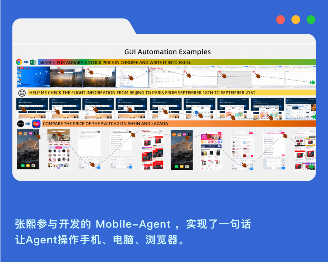2023年底,大模型方兴未艾,正在阿里实习的张熙和同事读着一篇用大模型作图标定位的论文,突然想到,能不能让大模型做更高阶的应用,直接帮人们操控手机或电脑?比如帮忙点奶茶、打游戏、做PPT……