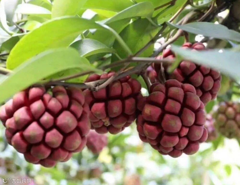 也叫做“黑老虎”,外形奇特,被戏称为“恶魔果实”。这个品种原本为野生,后来经选育改良成为现在药食同源的新型水果。完全成熟的布福娜果皮呈黑紫色,表面类似菠萝,味道微甜有芳香,果肉颜色和荔枝相似。除了鲜食,布福娜还可作为药材、化妆品原料以及酒类的原材料,收益更高。