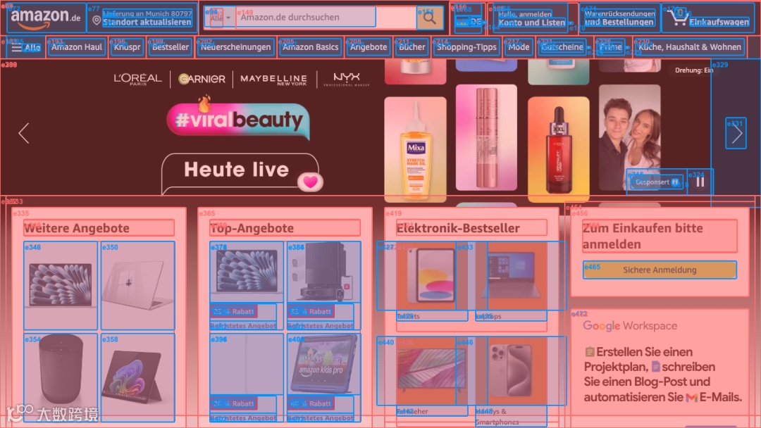 SoM (Set-of-Mark,标记集)截图带来了一个有趣的设计挑战:我们需要在截图中标记出所有可交互元素,并为每个元素绘制边框和编号。