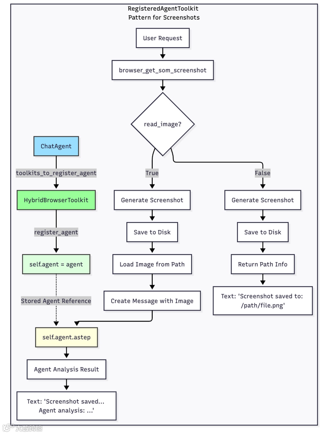 这个优化需要与 CAMEL 的 AI 智能体注册机制相配合。通过 RegisteredAgentToolkit基类,我们允许工具包(Toolkit)访问注册了它的 AI 智能体实例。具体来说,当 browser_get_som_screenshot被调用时,如果检测到已注册的 AI 智能体,它会自动调用该智能体的 astep()方法,并传入一个包含图片路径的 Message对象。AI 智能体内部再使用 PIL 加载图片,并将其传递给多模态 LLM 进行分析。