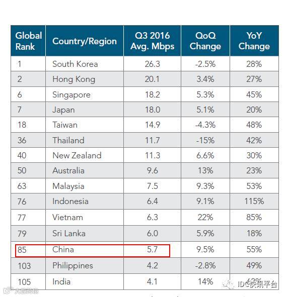 国际组织数据则主要是来自Akamai,Akamai是全球最大CDN服务商,它在每个季度都会推出《互联网发展报告》,报告内容涉及互联网普及率、宽带网速、移动网速、数据流量增长、网络安全等多个方面。最新的一期报告为2016年第三季度,在报告中,中国固定宽带平均下载速率为5.7 Mbps。