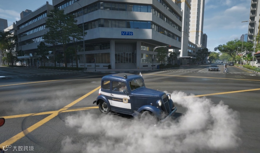 游戏中的载具开放世界跑图溜达的画面也是一大亮点。虽然说在只有一辆“老头儿乐”警车的演示,警灯一开优哉游哉,仿佛全世界都是主角家客厅。但爽是真的爽,画面一看就很烧显卡。