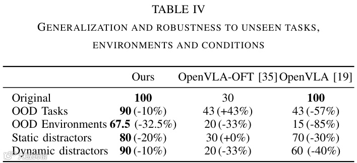 分布外任务:在未见过的任务、环境及静态/动态干扰下,平均性能提升34.9%。动态干扰(如人类走动)下仅性能下降10%,静态干扰(杂乱环境)下下降20%,泛化性显著优于OpenVLA系列(table4)。
