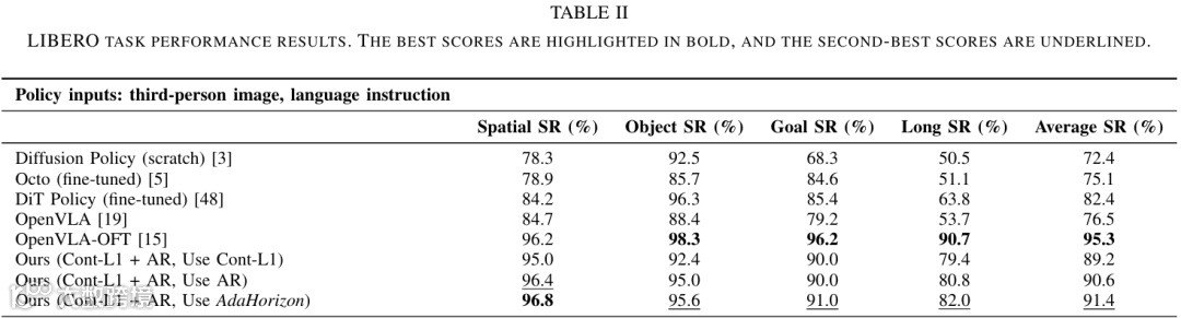 集成器优势:AdaHorizon在空间任务中成功率96.8%,比次优集成器高出1.6%,避免传统集成器过度平滑动作流的问题(table5)。