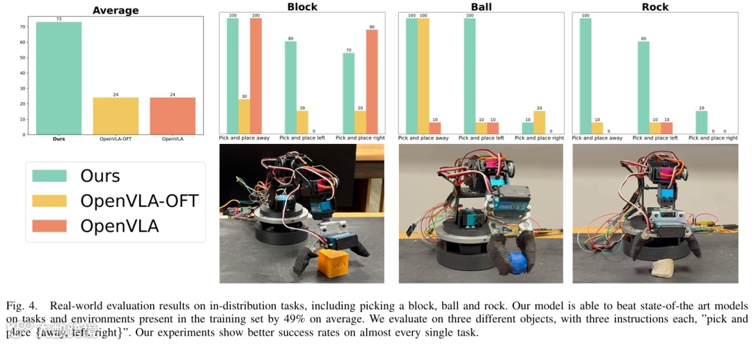 分布内任务:在拾取块、球、岩石等任务中,平均成功率比现有方法高出49%,球类操作表现稳定,仅“拾取并放置到右侧”任务略逊于基线(figure4)。