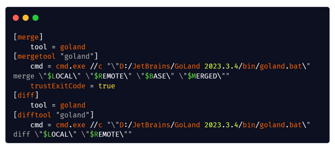 这里参考了其他的文档关于git mergetool的使用方法,配置goland作为合并冲突解决工具: