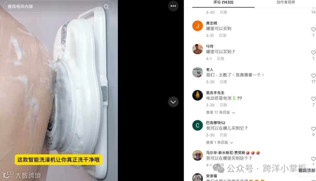 TikTok美区持续孵化洗浴爆款,除非洲海绵网外,一款壁挂式硅胶沐浴刷在28天内售出1.66万件,销售额突破10万美元[k]。智能电动搓澡刷、国产全自动洗澡机等科技产品也崭露头角,一则国产洗澡机视频播放量超670万次,引发大量购买咨询[k]。